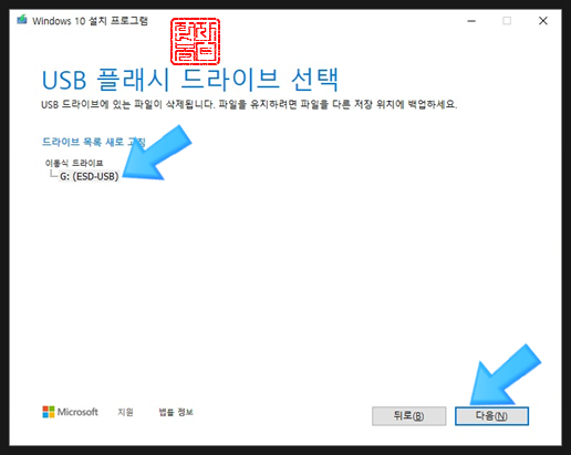 연결한 USB 메모리인지 다시 한번 확인하고, '다음'을 선택합니다.