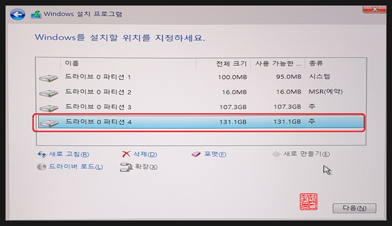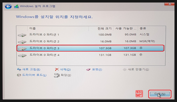 해당 파티션을 선택하고, '다음'을 선택합니다.