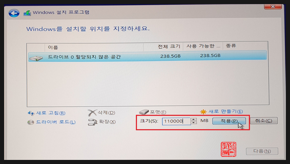 저는 110,000MB를 기입하고 '적용'을 클릭하였습니다.