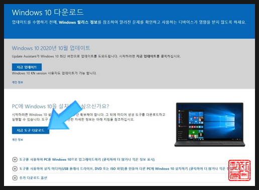 마이크로소프트 'Window 10 다운로드'페이지로 이동하였으면 설치 프로그램을 다운로드해야 합니다.