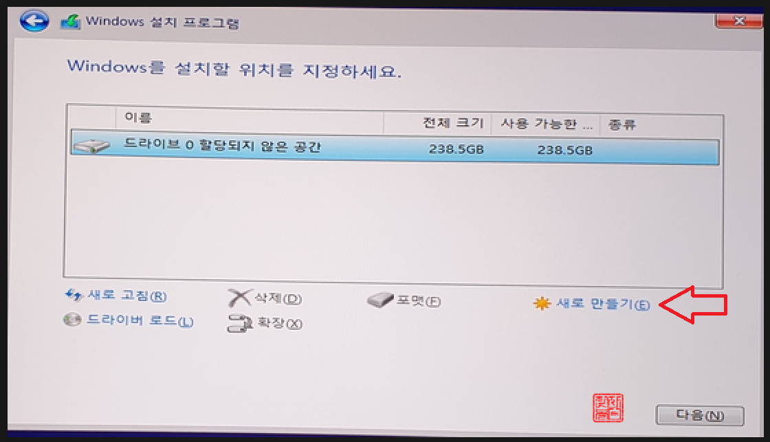 모든 파티션이 삭제되어 할당되지 않은 영역을 선택하고, '새로 만들기'를 선택합니다.