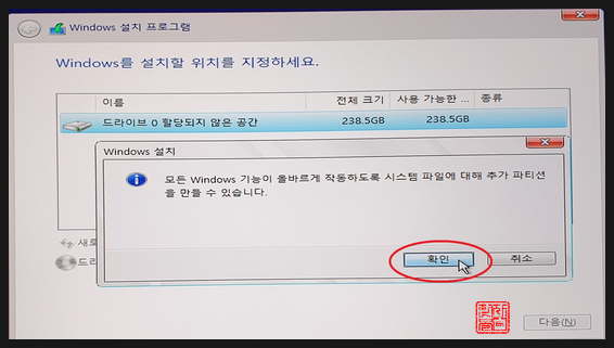 전체 238.5GB 중 C:\ 와 D:\로 파티션을 나누고, C:\에 OS를 설치하고자 합니다.