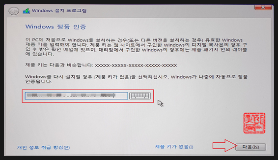 이미 숙지하고 있는 제품키를 기입합니다.