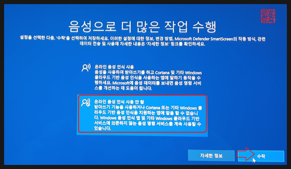'온라인 음성인식 사용 안 함'을 선택하고, '수락'을 클릭합니다.