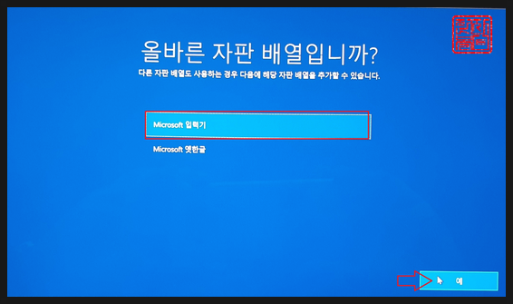'Microsoft 입력기'를 선택하고, '예'를 클릭합니다.