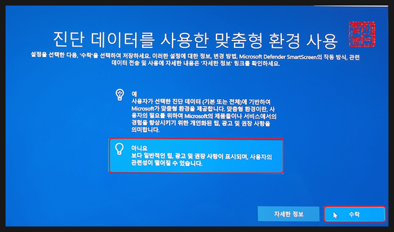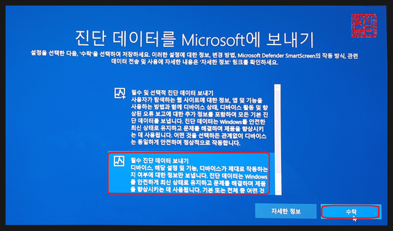 '필수 진단 데이터 보내기'를 선택하고, '수락'을 클릭합니다.